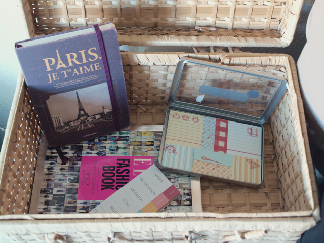 Más regalos chachis, esta vez de mi prima:  una agenda super molona de París, unos post-it de cocina, y unas pegatinas geniales para marcar las páginas de las revistas. Además de un neceser y la taza del chocolate de la primera foto… ¡Y todo en una cesta de mimbre monísima! Me encantó todo 🙂