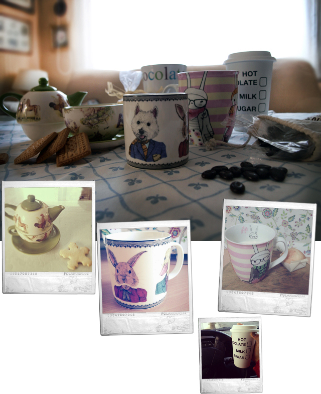 Lo sé, soy la tonta de las tazas… Y estos días se han sumado muchas nuevas a mi colección. ¡Y ojo! Que cada una tiene una función: la tetera evidentemente para el té, la de los animales para el café (tiene el tamaño perfecto para entrar en la cafetera), la de chocolat, para el chocolate, la de porcelana para llevar, y la de fifi para el colacao 🙂