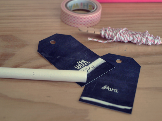 Hacía ya tiempo que no hacía unas etiquetas imprimibles… Y me apetecía mucho hacerlo imitando a la pizarra. Ya he aborrecido el empaquetado con papel kraft, y me encantan los que son en blanco y negro y con algún detalle a color. Así que la pizarra está genial para este tipo de mezclas de colores.