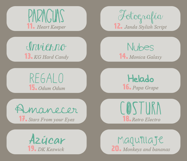 Muchísimas gracias! no hay ninguna que no me haya gustado 🙂 son todas superbonitas! yo tengo una carpeta en Pinterest donde voy guardando todas las fuentes que me gustan por si algún día las necesito para algo y estas ya se han ido derechitas para allá!