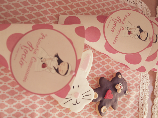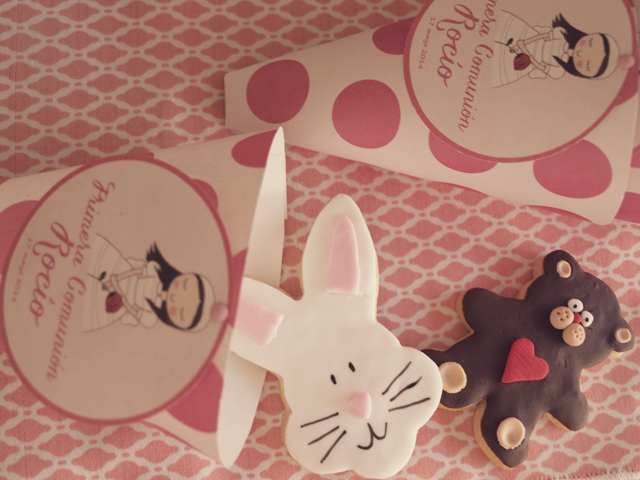 Los de mi sobrina iban en tonos rosas, porque toda la decoración de la comunión fue así. Además, le añadí una etiqueta con la ilustración de sus recordatorios. Pero, como podéis imaginar, en ese sentido tenéis miles de opciones.