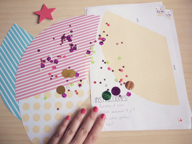 Para pegarlo, tenemos muchas opciones: pegamento de barra, celo de doble capa, washi tape, celo del de toda la vida (aunque quedará más feito)… En mi caso, opté por el washi tape, porque no tengo ni celo de doble capa ni un pegamento de barra en condiciones, y washis tengo una buena colección. Además, estos te permiten jugar con los contrastes de colores y estampados. Eso sí, procurad que sea medianamente bueno… En la comunión hubo más de un cono que se despegó 😉
