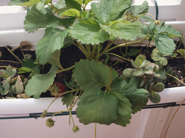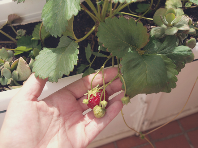 De hecho, tenía ya una fresa creciendo, aunque se perdió durante el trayecto. Pero bueno, la colocamos en una maceta grande y no ha tardado mucho en hacerme feliz. Ya me ha dado cuatro fresas (las que veis en las fotos), que probé ayer y puedo deciros que están riquísimas.