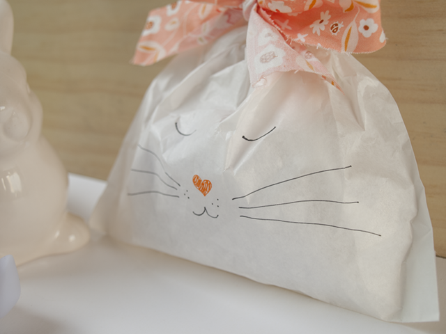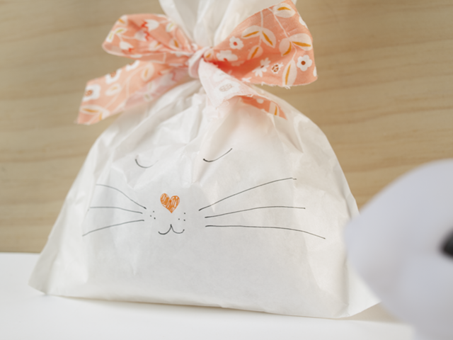 Para conseguir este envoltorio de conejo, solo hace falta una bolsa de papel (a ser posible blanca o color kraft), un rotulador o bolígrafo, y un lazo o un trozo de tela para crear el lazo.