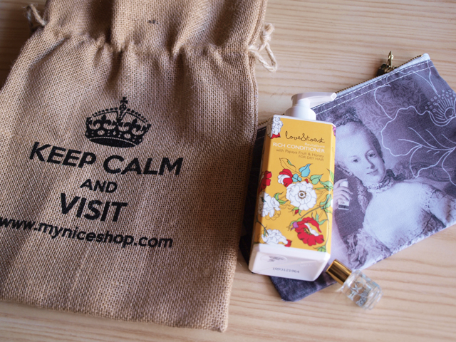 My Nice Shop acompaña desde hace muy poquito al blog como sponsor. Pero antes de eso, Fátima quiso tener un detalle conmigo y me envió este paquetito: un acondicionador con packaging amoroso y que va de maravilla, un perfume de viaje y un neceser muy mono. Y todo en una bolsita estampada con un Keep Calm que me pareció de lo más molón. ¡Estoy encantada con esta tienda, con que me acompañe y con mis nuevas cositas!