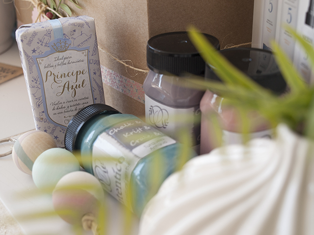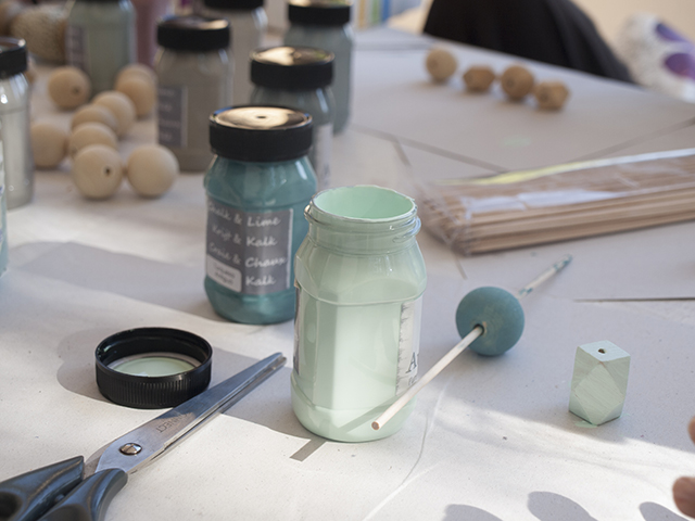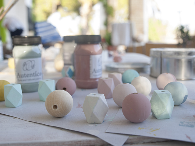 También hicimos un taller de collares y llaveros con cuentas de madera y toda la preciosa pintura chalk paint que nos envió Crea Decora Recicla. ¡Es una maravilla! Mira que yo estaba reticente con esta pintura tras mi primera prueba, pero la de esta marca me enamoró. Y quedaron unas piezas preciosas.
