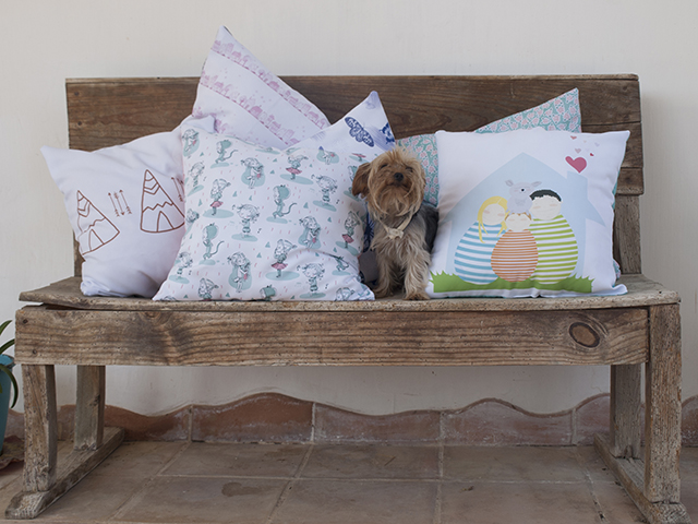 Estampable nos brindó la oportunidad de diseñar nuestra propia tela para hacer un cojín. No quiero enseñar mucho de esto ahora porque hice fotos para hacer un diy en un post aparte, pero aprovecho para mostrar el maravilloso taller que tiene Santy, y una foto de cómo quedaron algunos de los cojines, con Tola como protagonista, una perrita de lo más simpática que casi, casi, fue una lilu más esos días 🙂