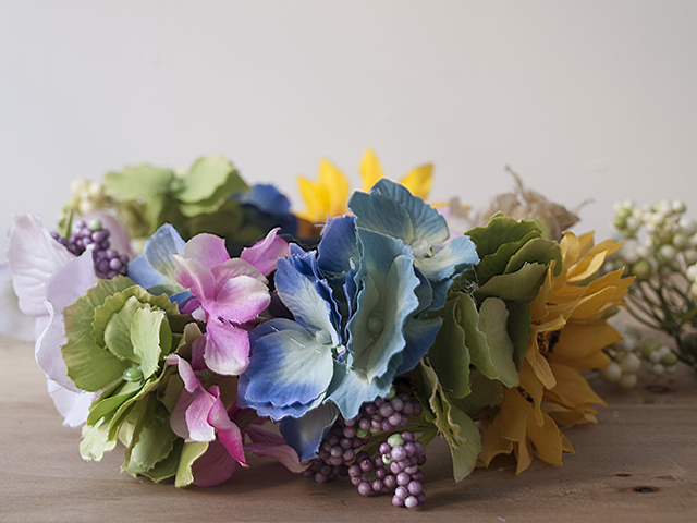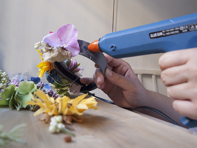 Como no pegaremos la flor a ras de la diadema, sino que lo haremos por un punto para que lo demás quede «en relieve», podemos meter luego cosas por debajo de las flores: hojas, ramitas de bolas, otras flores más pequeñas… Podemos jugar con las capas hasta que consigamos un resultado que nos guste.