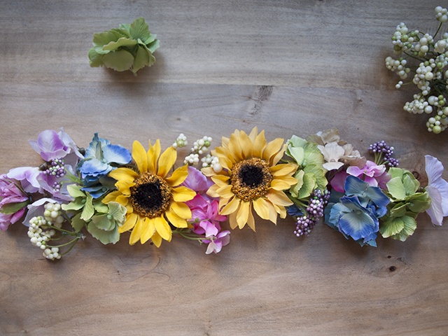 Antes de empezar a pegar, podemos hacer una prueba de cómo queremos organizar las flores sobre la mesa, en línea recta. Así no tenemos que devanarnos los sesos cuando estemos pistola en mano.