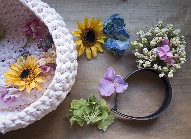 Yo la hice con flores de plástico, que podéis encontrar en bazares chinos, grandes almacenes o incluso en floristerías. La verdad es que tuve suerte, porque como mi tía tiene muchas para sus manualidades, fui a su casa y le saqueé las cajas. Pero vamos, si tenéis que comprarlas, no será un gran desembolso porque son baratas.