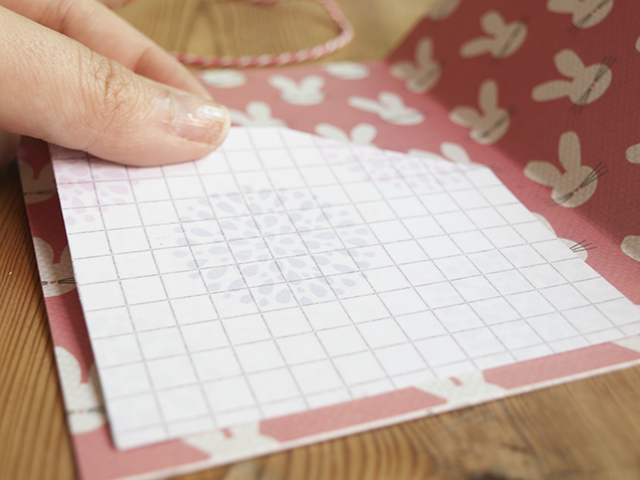 Una vez que tenemos nuestras dos partes, el cartón de cereales y el papel, tenemos que juntarlas. Yo lo hice con celo de doble capa, pero también podéis hacerlo con pegamento. Eso sí, imprescindible: poner el adhesivo por la parte de los dibujos de los cereales. Parece una obviedad, pero en mi primer intento me despisté, lo puse en el lado incorrecto, y tuve que tirarlo todo, papel de conejitos incluido 🙁