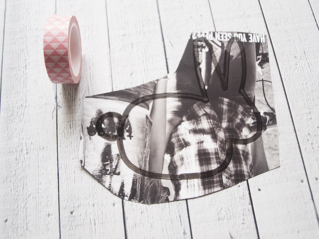 Si nuestra forma es más compleja, podemos dibujarla antes de pegar los washis, y luego cortar la portada de la revista con una forma aproximada, así no tendremos que desperdiciar demasiado celo japonés.