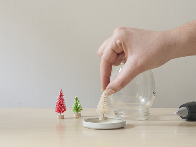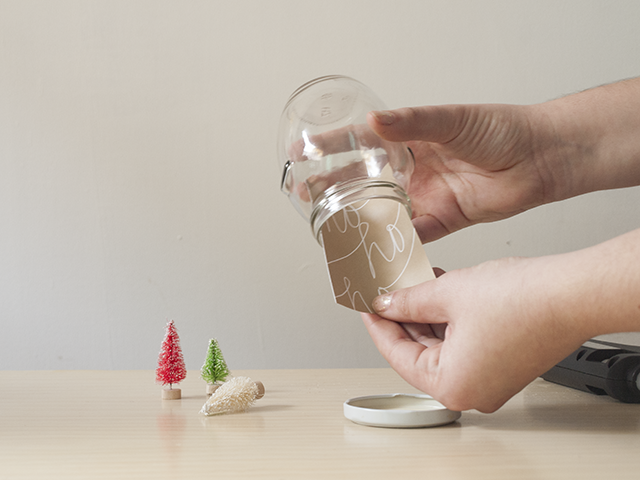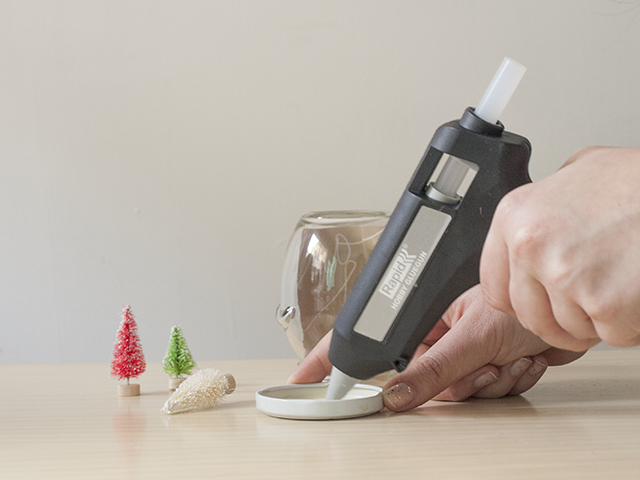 El segundo bote es mi favorito. Para ello, di la vuelta al frasco, dejando la tapadera boca abajo. Metí uno de los papeles, que pone «ho ho ho». A continuación, con una pistola de silicona, puse un poco de pegamento y coloqué los tres arbolitos en la tapa. Dejé secar.