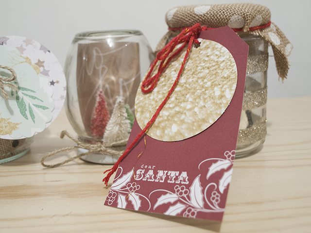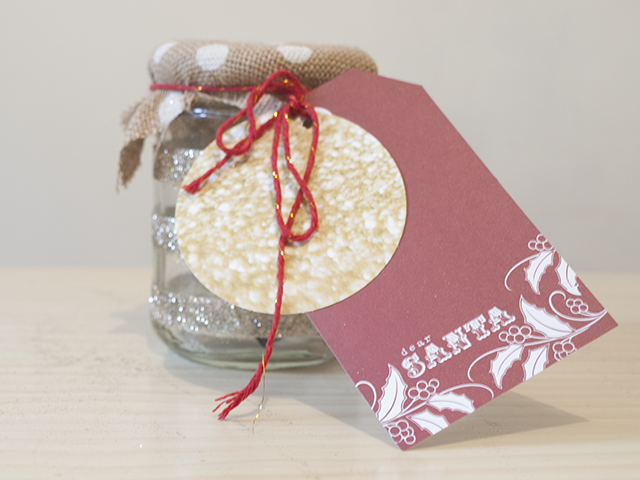 Una vez seco, un poco de cuerda, y unas etiquetas hechas con papeles bonitos y una troqueladora hacen el resto. Un bonito bote que, sin los detalles navideños, se puede usar luego para acumular cualquier objeto o guardar el té.