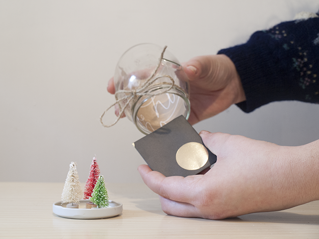 Luego añadí una cuerda y ya podemos abrir y cerrar el tarro todo lo que queramos, como para meter el regalito dentro, bien envuelto. Y después, se puede usar como decoración navideña, solo con los arbolitos y el fondo. ¡Es una monada!