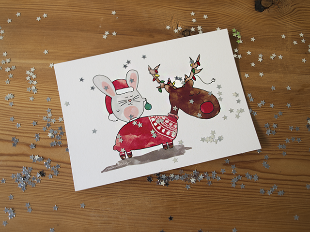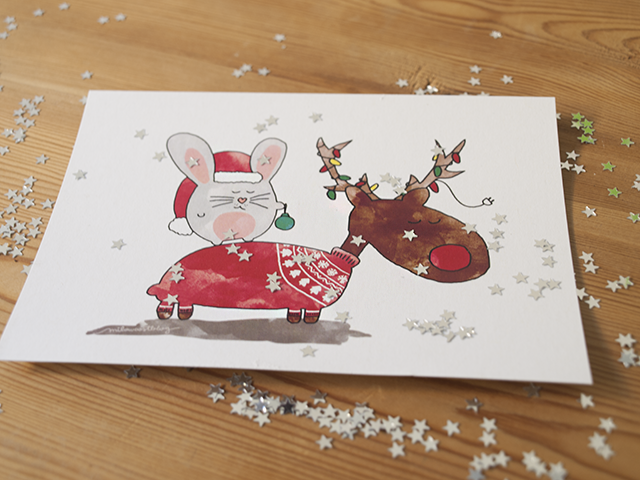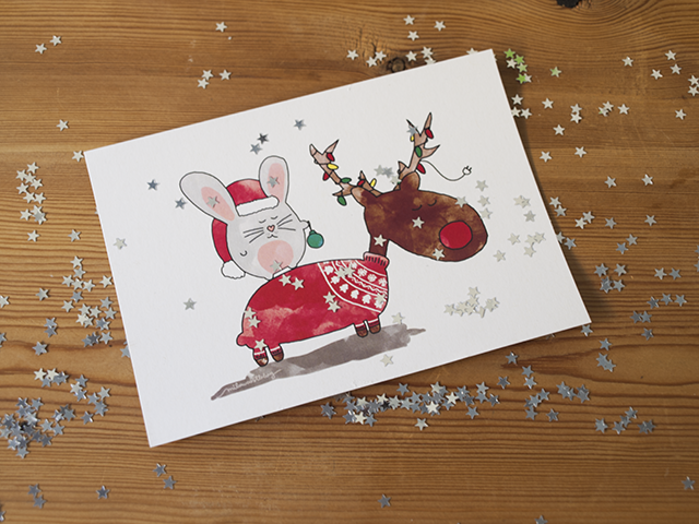 Es una postal navidad Imprimible que diseñé para el calendario de adviento de Scarlata y el Señor Don Gato. En ese momento, le añadí un «12» a la bolita que sostiene el conejo, ya que era el día del calendario que me tocaba a mí. Pero para traerlo como imprimible por aquí se lo he quitado para que sea más versátil 🙂