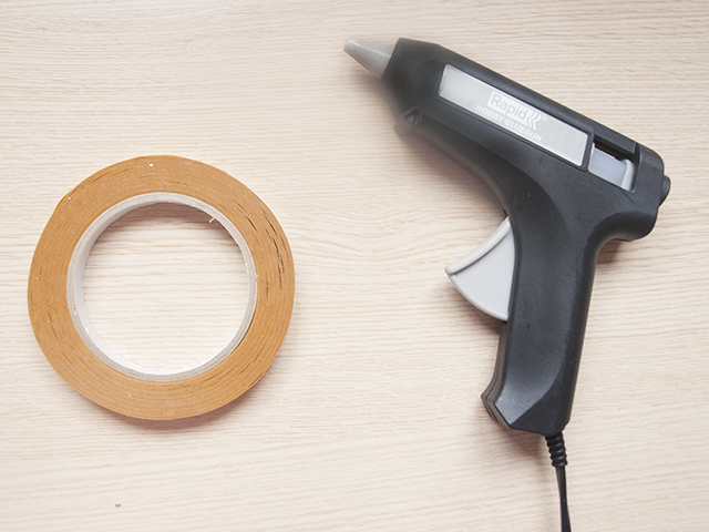 En cuanto a los adhesivos, para mí hay dos básicos: el celo de doble capa (para trabajos de papel y materiales que no pesan con superficies planas, como tela) y la pistola de silicona (vamos, de barras de pegamento) para pegar objetos con un poco más de consistencia. Ambos materiales disponibles en tiendas de manualidades, de bricolaje y en grandes superficies.