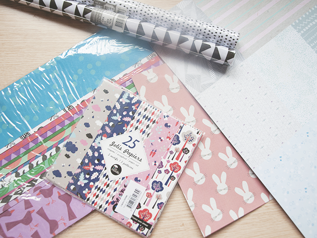 Papeles bonitos. Y no hablo solo de scrap, sino también papeles de envolver, de origami, o simplemente láminas de papel para cualquer manualidad. Siempre que voy a tiendas de manualidades y «de todo un poco» me llevo algunos porque nunca están de más.