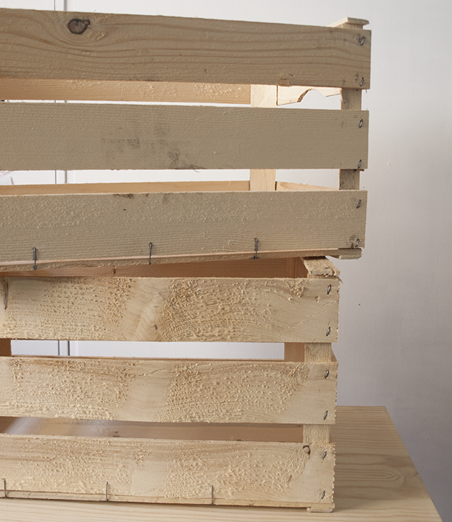 Lo primero que tenemos que hacer es quitar la tabla superior y la primera lateral de una de las cajas. Será la que irá debajo, y debemos hacer esto para dejar hueco.