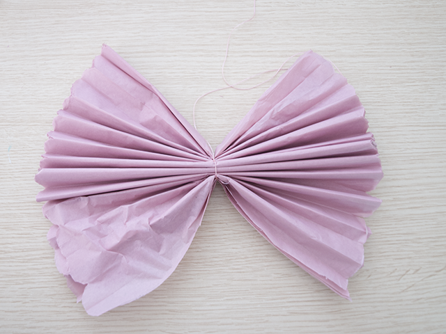 Ponemos todas las hojas una encima de otra y empezamos a doblar en zigzag, procurando hacer todos los pliegues del mismo tamaño. Una vez terminado, hay que sujetar nuestro «acordeón» por el centro con un hilo o cuerda:
