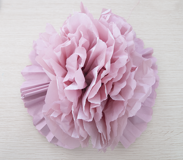 ¡Y eso es todo! También podéis combinar dos colores en un solo pompón. En este, fui poniendo una hoja de amarillo, otra de verde menta, hasta que se gastó el papel de seda. Es también una buena opción para cuando no tenemos papel de seda suficiente para hacer uno solo.
