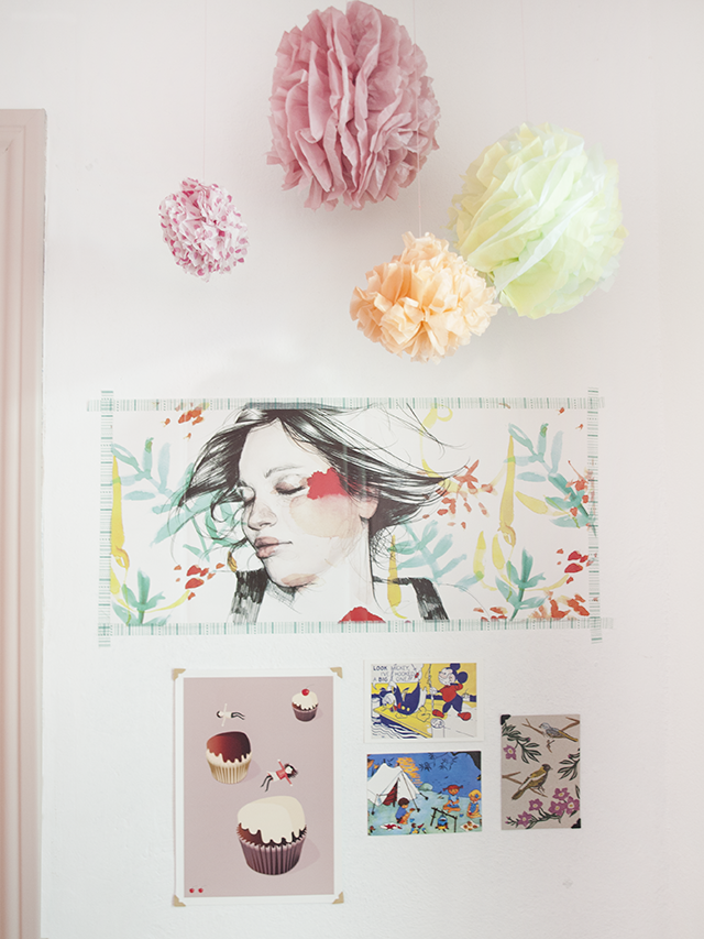 Los fijé al techo con un poco de washi tape (de los buenos, para que no se despegue), porque no conseguí clavar ni una chincheta. Aun así, pensad que los pompones pesan poco así que con eso debería de ser suficiente.