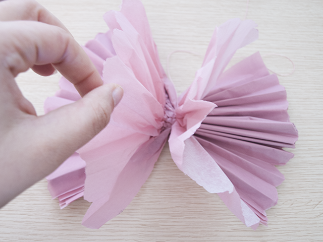 Luego estiramos nuestro acordeón hacia ambos lados, de forma que quede como un lazo. Luego, iremos levantando pliego por pliego, con cuidado de no romperlo, que ya sabemos que el papel de seda es muy delicado: