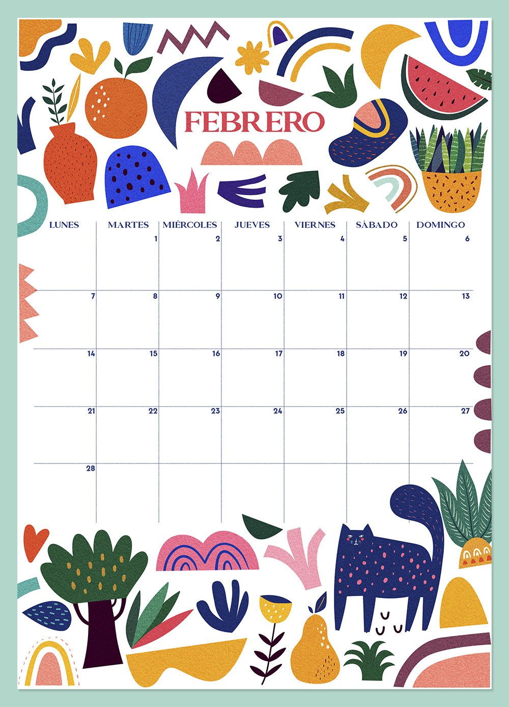 Por eso he elegido un estilo diferente para este calendario febrero 2022, pero a tope de color y de buen rollo, a ver si así lo invocamos un poco. Sé que los diseños más «románticos» suelen funcionar mejor, pero espero que te guste 🙂