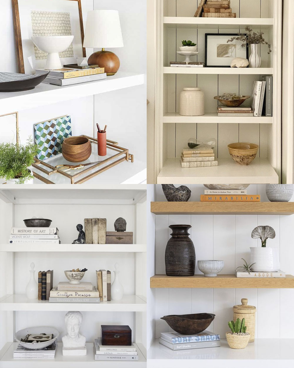 Las bandejas también son un must en las estanterías. Y sí, claro, puedes colocarlas en horizontal y usarlas para crear pequeñas composiciones sobre ellas. Pero si las pones en baldas más altas, no se van a ver. Puedes colocarlas apoyadas sobre el fondo y presumir de su diseño o su textura. Además, así cubren una buena parte de la superficie y crean un efecto visual bonito.