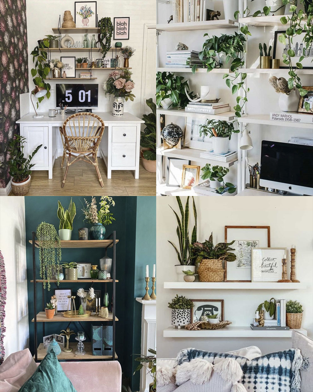 En estanterías lo que más me gusta son las plantas (y los esquejes metidos en botellitas de cristal). Siento que el verde combina con todo y sirve de «pegamento» para que todo lo demás se vea integrado cuando en realidad son cosas random.