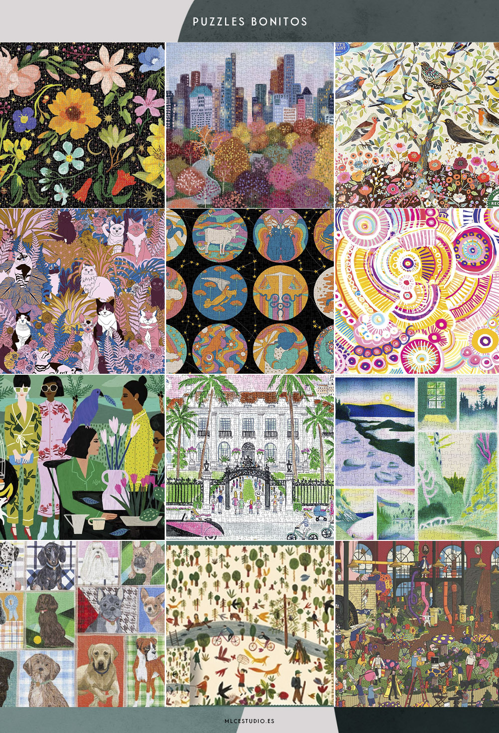 Museo de perretes, Galison | Pájaros del mundo, Ravensburger | Ciudad verde, Mudpuppy | Hojas, Smith Street | Noche mágica, Flow | Club de lectura, Mudpuppy | Pétalos, Cloudberries | Granja, Kikkerland | Comidas del mundo, Gibsons | Castillo geométrico, Cloudberries | Abstracto, Hardie Grant | Floristería, Mudpuppy.
