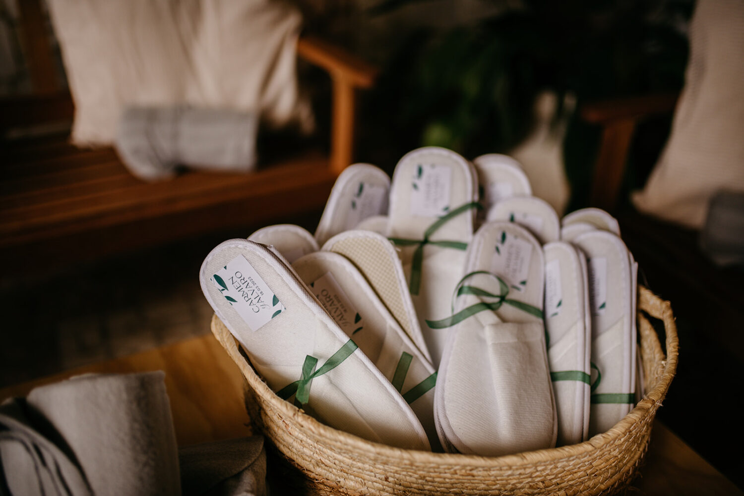 Como la boda era en marzo, mucha gente tenía el miedo de que pudiera pasar frío. Además de varias estufas en todos los rincones de la boda, preparamos un montón de mantas (las básicas de Ikea), con las que la gente arrasó. Siendo una boda de «invierno», no pegaba poner chanclas o alpargatas para las invitadas a las que les dolieran los pies. La solución fue… ¡zapatillas de andar por casa!