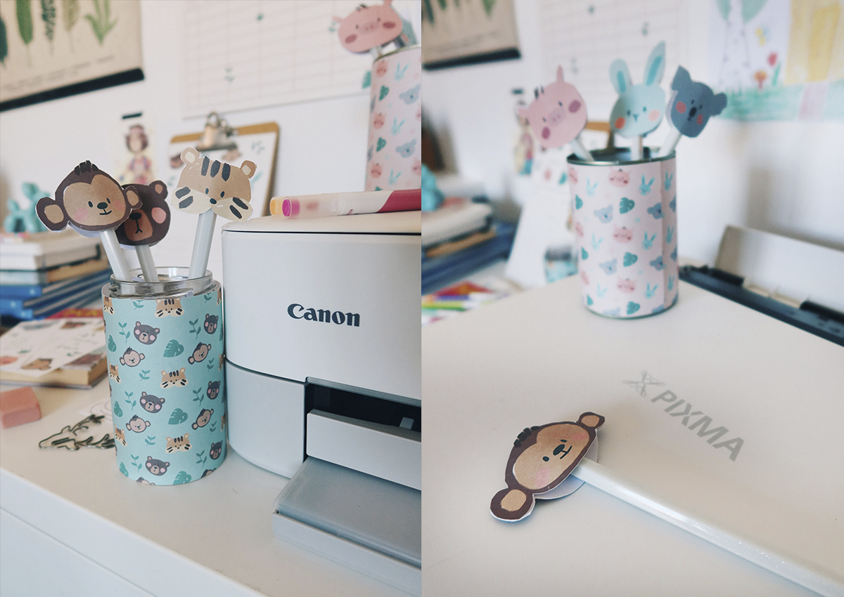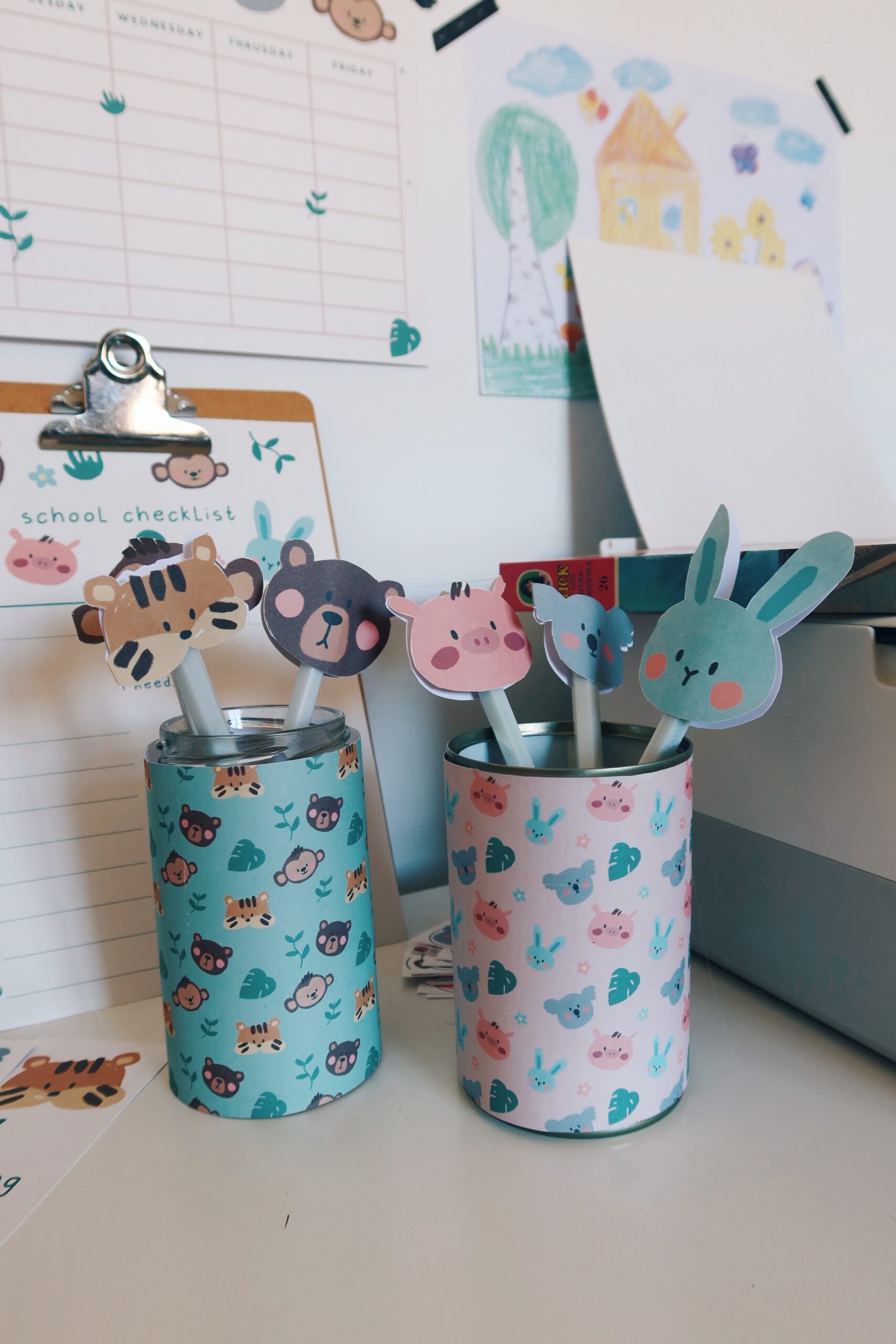 Y finalizamos, como comenté al principio del post, con una pequeña manualidad. Convertiremos latas o frascos de vidrio en lapiceros, con bolígrafos decorados que irán a juego. Simplemente tenemos que recortar, forrar el envase, y listo. Y para decorar los bolis o lápices, recortamos el animalito y lo pegamos en la punta. ¡Son lo más!