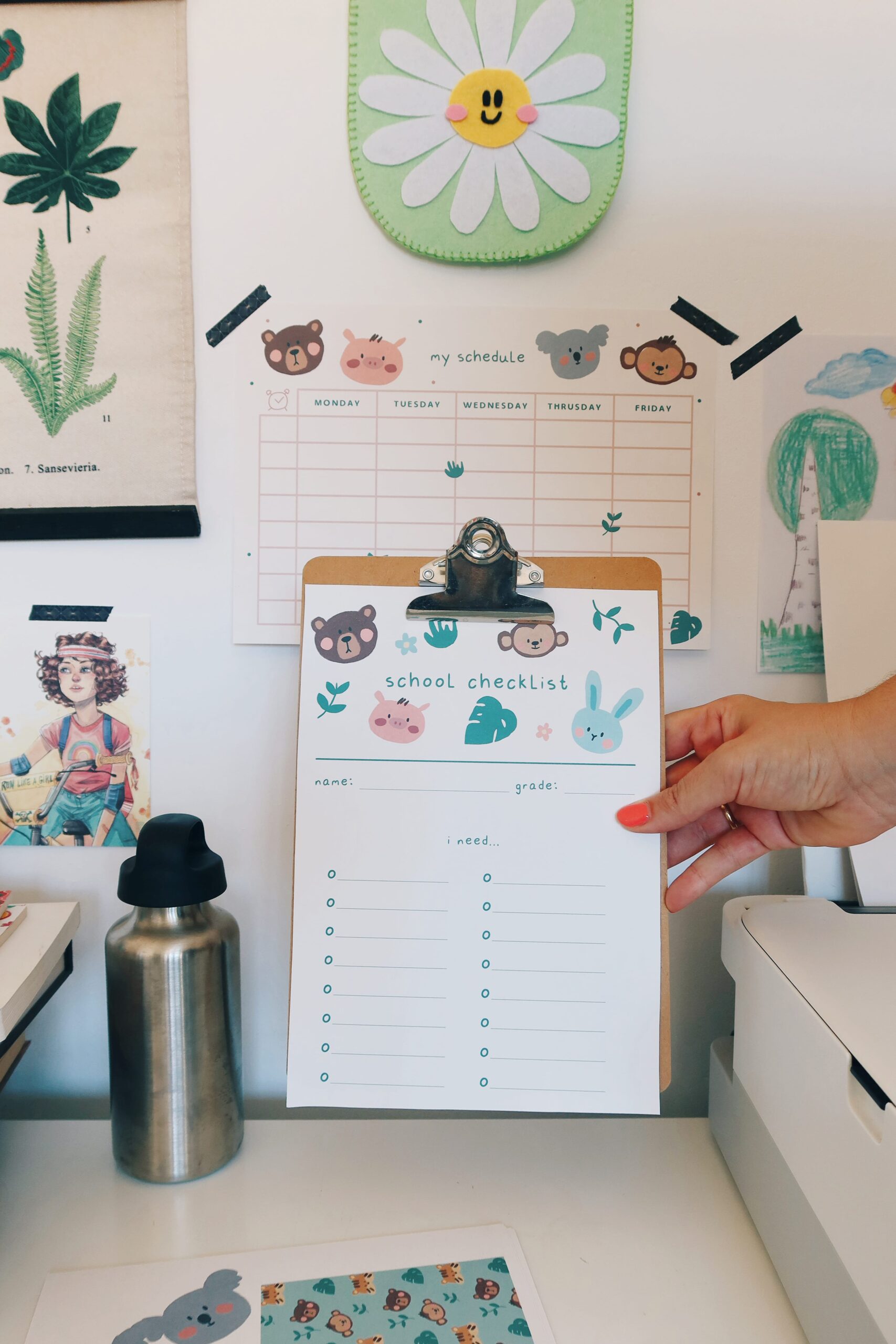 Empezamos con el imprimible del horario y el planificador para preparar lo que necesitamos para el cole. El horario, obviamente, viene genial para organizar las diferentes clases, o, quién sabe, igual también para las extraescolares, o las tareas de la casa. Por otro lado, tenemos la checklist para marcar qué necesitamos. Cosas que necesitamos llevar en la mochila, para un trabajo de clase, para una excursión… ¡Lo que haga falta! Al ser imprimibles individuales, podemos sacar tantos como necesitemos.