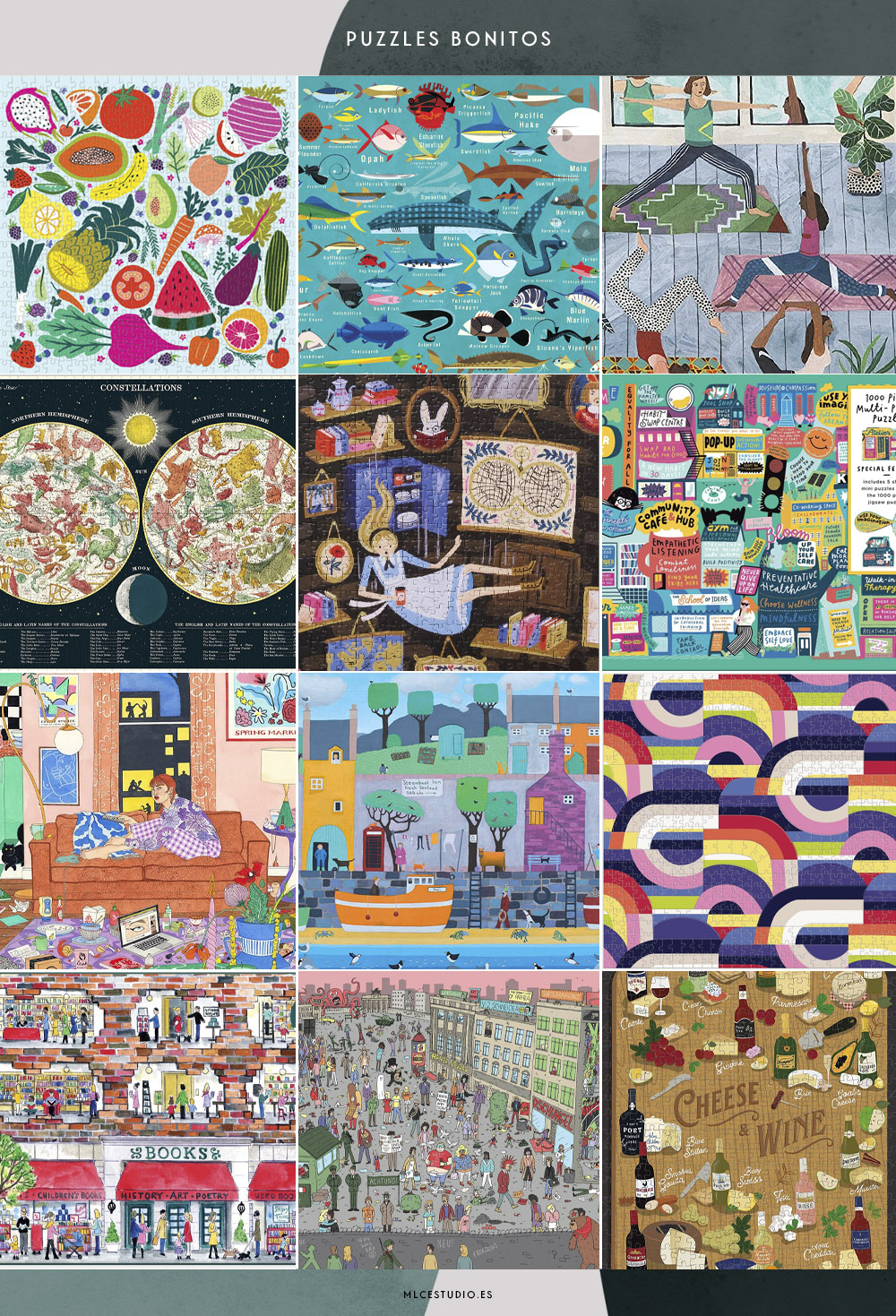 Verduras y hortalizas, Galison | Bajo el mar, Mudpuppy | Clase de Yoga, Talking Tables | Constelaciones, Cavallini | Alicia, Rifle Paper Co | Carteles callejeros, Galison | Día en casa, Hardie Grant | En el puerto, Ravensburger | Abstracto a doble cara, Mudpuppy | En la librería, Galison | Buscando a Bowie, Smith Street | Queso y vino, Ridleys.