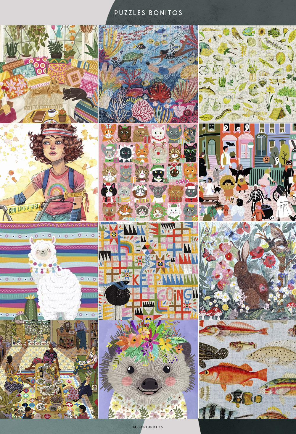 Gatetes relajados, Mudpuppy | Arrecife de coral, Eeboo | Todo al verde, Cloudberries | Run like a girl, Esther Gili para Educa | Gatos festivos, Galison | Halloween panorámico, Mudpuppy | Llama, Legami | Colorido y geométrico, Galison | Conejito, Eeboo | Plan en casa, Hardie Grant | Erizo florido, Heye | Peces, Cloudberries.