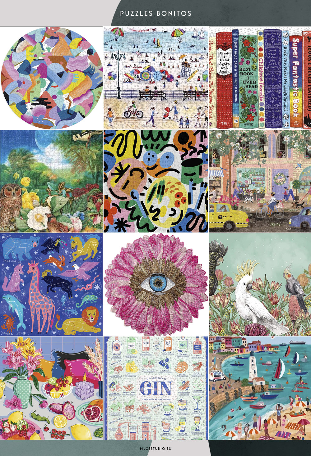 Si me sigues desde hace tiempo, ya sabes que no me gusta cualquier puzzle (odio los típicos de paisajes, de Disney o que reproducen cuadros famosos). Prefiero dedicar mi tiempo a un puzzle bonito, con ilustraciones originales, formas abstractas o aspecto, en general, más moderno. De hecho, no es el primer recopilatorio que hago, ya publiqué más de 70 puzzles aquí y otros 75 aquí.