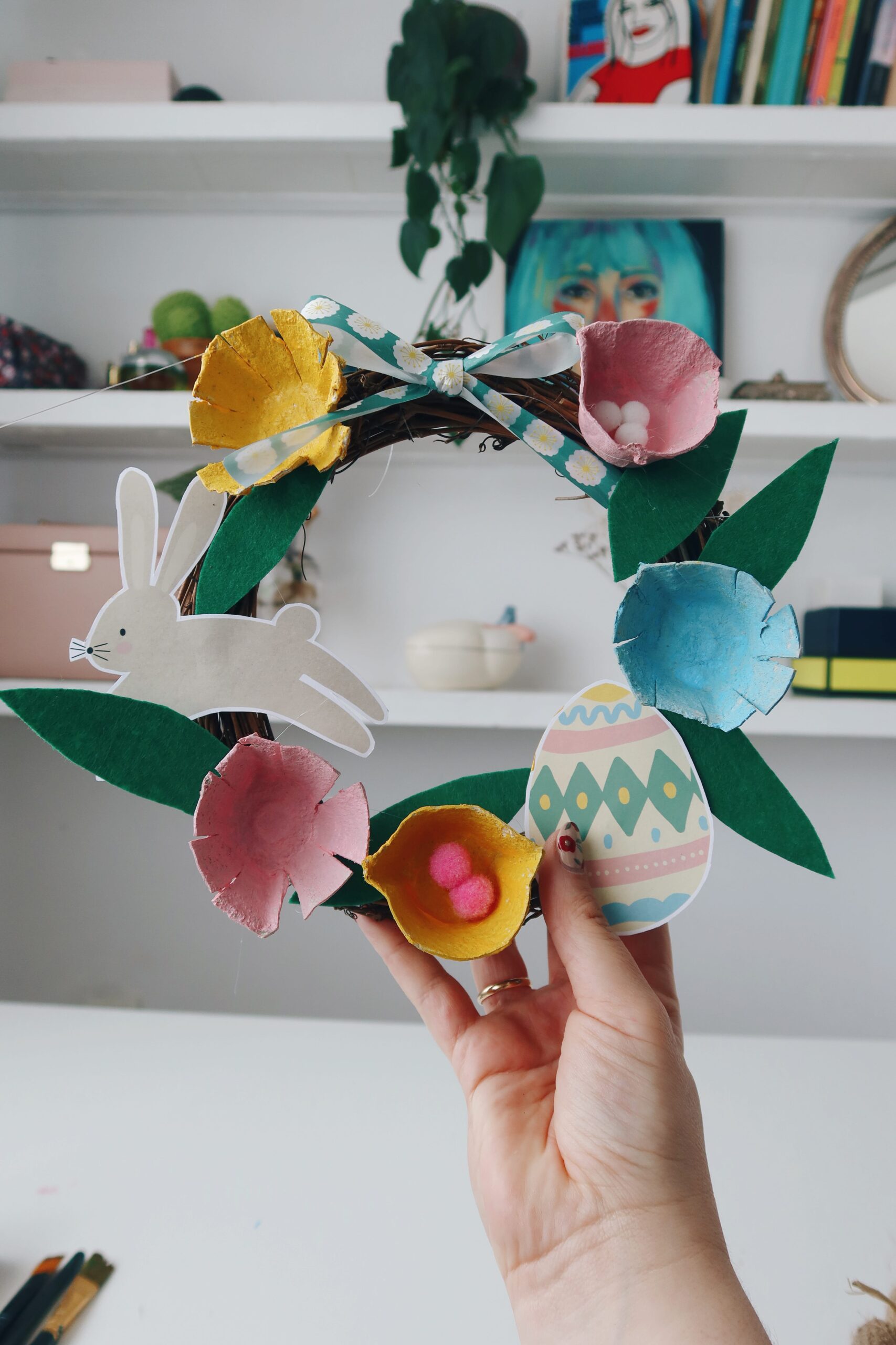 Para el montaje, podéis ver mejor el vídeo, pero tampoco tiene complicación. Imprimí algunos adornos de conejo y huevos, y sobre la corona fue pegando las hueveras a modo de flor, combinándolo con algunas hojas de fieltro. Añadí el toque con algunos pompones y un bonito lazo en la parte superior.