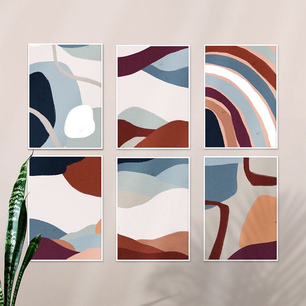 Colección de 6 láminas de estilo abstracto con tonalidades tierra y azules. Perfectas para colocar en un gallery wall, todas juntas o por separado.